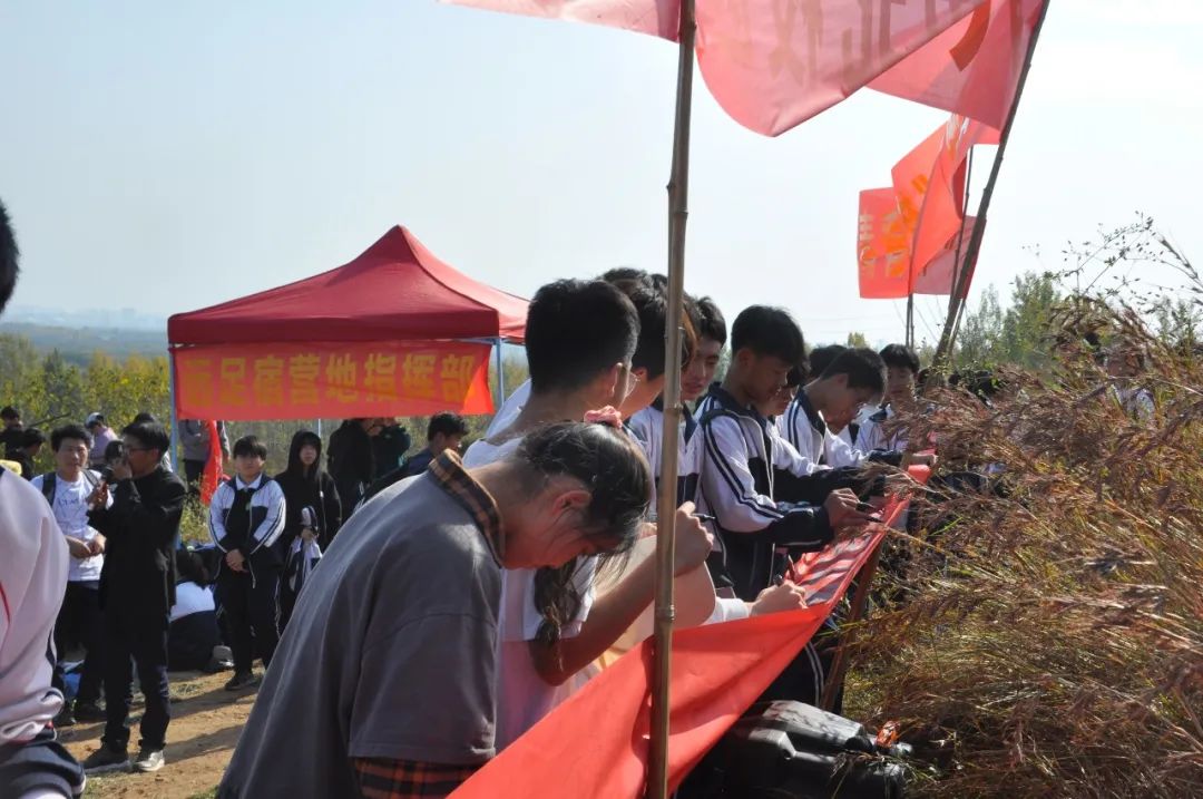 上午10:50所有師生成功到達了大本營。此時提前到達的志愿者隊員已經為大家搭好了帳篷、做好了各項指示標牌。按照事先規劃的場地,各班安營扎寨,原地休息,養精蓄銳,準備登頂。