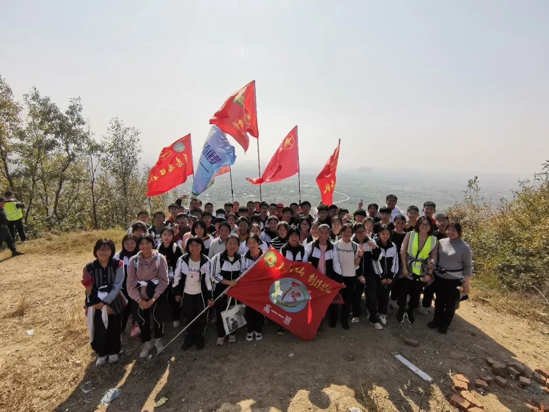 雖已深秋,驕陽依然烈如火,師生們砥礪志彌堅。磨山越來越近了,同學們打著班旗,唱著班歌,喊著口號,精神抖擻,伴著風景向前進發。