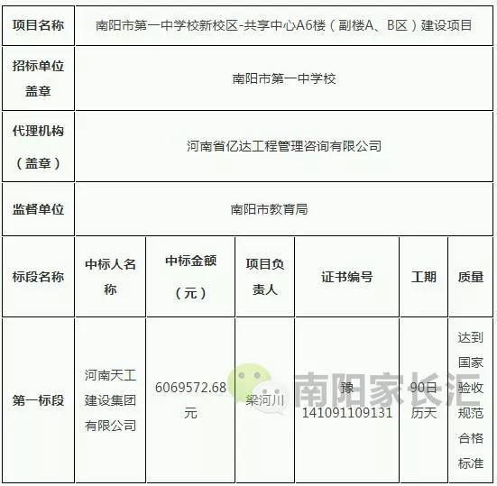 河南省政府采購網今天發布了南陽市第一中學校新校區-共享中心A6樓(副樓A、B區)建設項目中標結果公告。