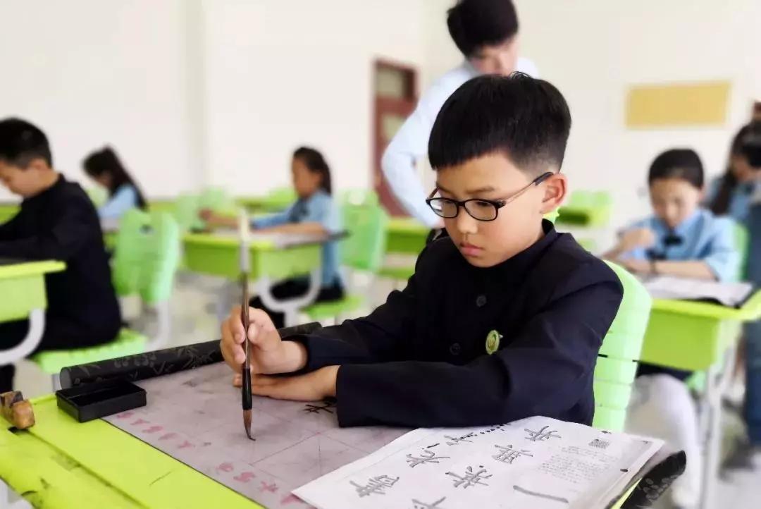 隨著王主任的講解,我們還來到了孩子們的“書房”——書法社團練字教室。走進教室,隨即讓我也產生了想提筆寫字的沖動。書法文化氛圍濃厚,古箏名曲伴隨,讓每個現場參觀者贊嘆不已。