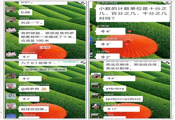 為了提高學生的學習效率,保障他們每個知識點都能掌握并融會貫通,蘇老師每節課后都精選作業讓學生獨立完成并分組提交,而后認真批改,并充分利用班級微信群對作業中存在問題進行答疑解惑;每天下午4點左右,讓孩子們及時交流探討當天的學習內容,讓思維碰撞出火花,切實保證“一個孩子都不落下”。