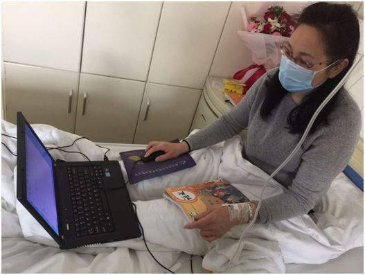 每天她要面對一百多學生的幾百頁拍照上傳來的各種作業,有作業照片橫向的、有模糊不清的、有顛倒頭的、有照片不全的,還有提交的照片是仰視的……每次改完這些“花樣”作業就得足足半天時間,如果再遇上改作文那就得滿滿一天,改下來眼睛已疼痛不堪 ,視物已模糊不清了。人也都不是鐵打的,經過這一個多月的超負荷工作,她失眠了。為了治失眠,她去診所開了中西藥,誰知服下后,整個腹部及胸腔劇烈疼痛,大汗淋漓。就是這樣,她仍放不下工作,夜晚忍著劇痛,把電腦搬到床邊繼續整理發給學生的學習筆記。在連續疼痛一天兩夜,實在無法忍受的情況下才勉強去醫院做了檢查,結果轉氨酶高出正常人的幾十倍,診斷為急性肝損傷,肝已大面積壞死,必須馬上住院治療,可她放心不下那群孩子。她把病房當課堂,把電腦擺在了病床上。病房里沒有Wifi就蹭手機流量,一人開著別樣的課堂。醫生看到后,趕忙合上她的筆記本電腦,讓她靜心養病。她總是說:“多休息這一會兒,病也好不了,可耽誤畢業班百十個孩子的學習,就再也補不回來了!”醫生走后,她照常打開電腦給孩子們上網課,家人們也攔不住,只好偷偷抹眼淚。