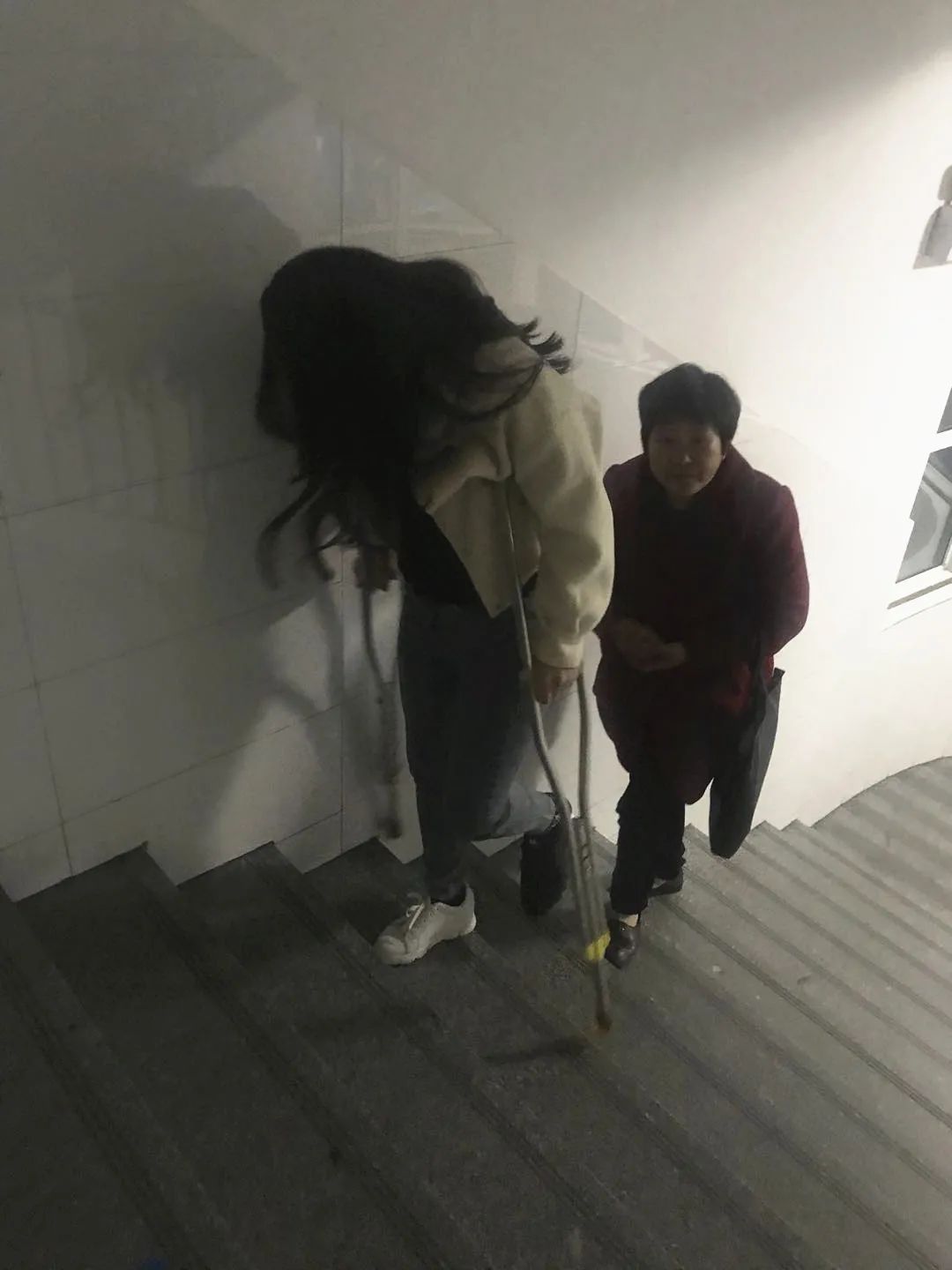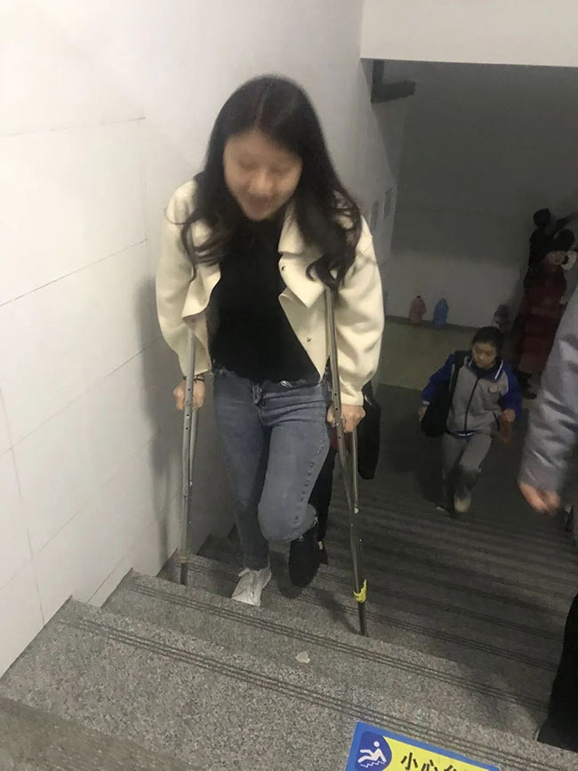 唐老師的教學樓層較高,在六樓。腳不能著地,唐老師便想辦法用雙拐上樓。用拐杖上樓要比平常耗時耗力許多,所以早讀要早起30分鐘,五點就要起床準備,家人也早早起來一起張羅。往?;▋煞昼娋湍茏咄甑穆烦?,現在卻需要花上20分鐘。唐老師靠著拐杖,用盡全力,撐起身體,一級一級往上蹦。每層樓的臺階22級,一共有6層,這就意味著,這樣艱難的蹦跳挪動需要重復132次,才能到達班級。