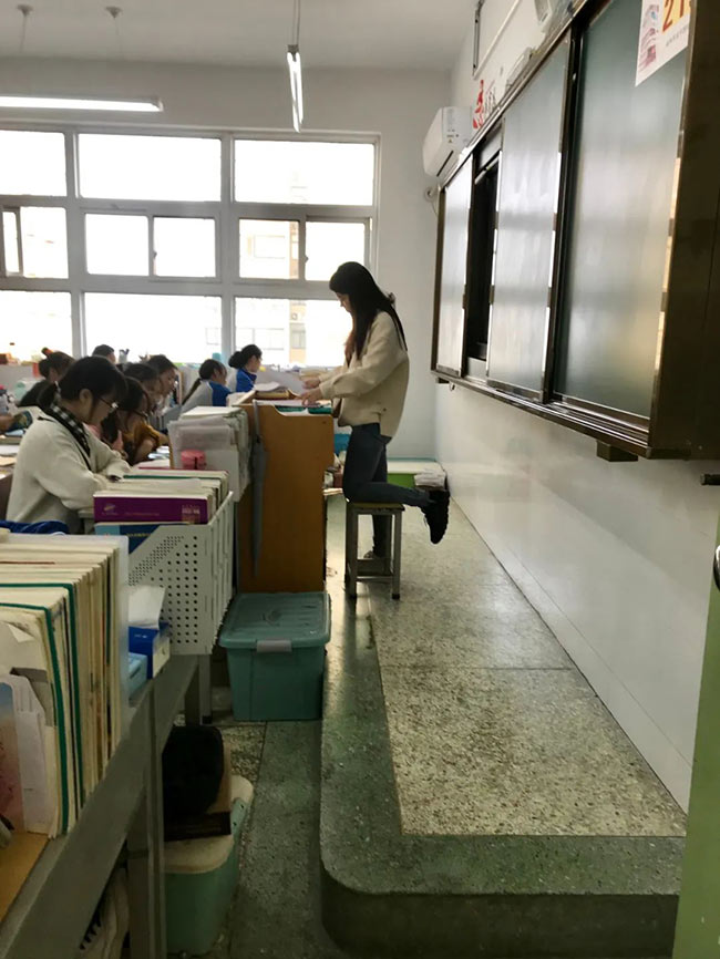 傷痛給唐老師帶來了許多困難,但為了學生,總能一一熬過。上課站得久了,腳傷處總會生疼。外加摔倒時,身上尤其是膝蓋處的嚴重擦傷,給平時走路和單腿跪在凳子上上課更添一份疼痛。盡管如此,唐老師依然擔心早讀時如果坐在講臺上,看不到學生背書,學生會偷懶打瞌睡,就盡量站著,確保能隨時清楚得觀察到學生,并提醒學生。擔心上課時坐著講課效果不好,就把腿放凳子上,單腿站立講課,力求更好的掌控課堂,讓學生多吸收一點知識。早讀加上課,往往單腿一站就是3個多小時,比平常要勞累艱辛的多,但是唐老師一天都沒中斷過。