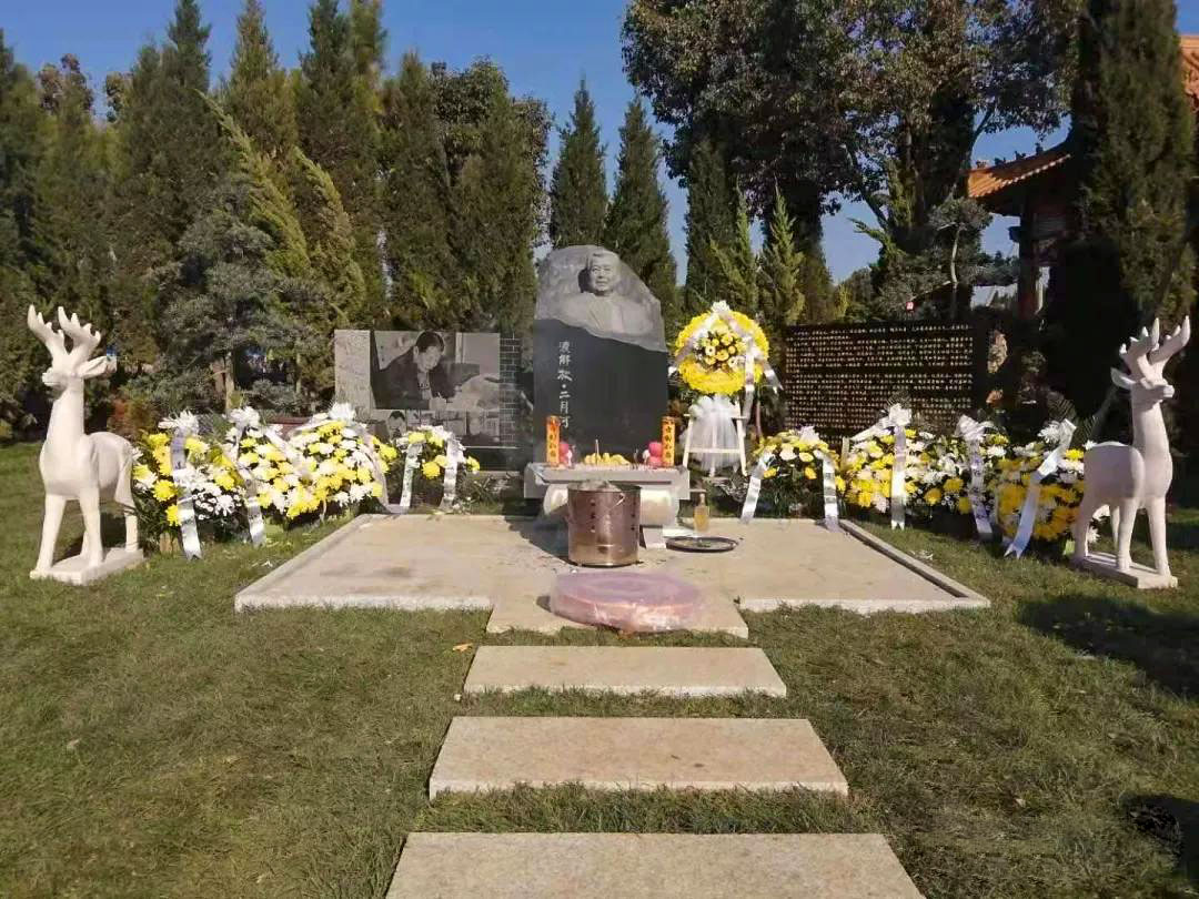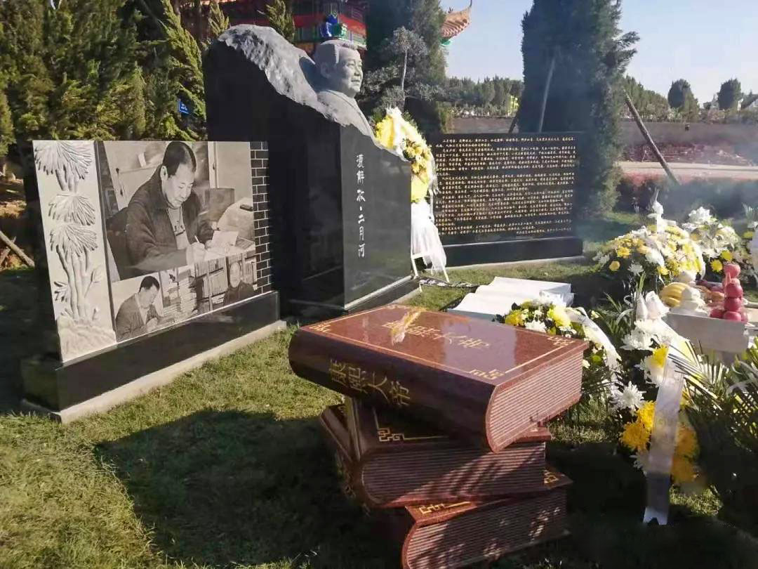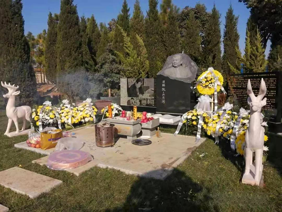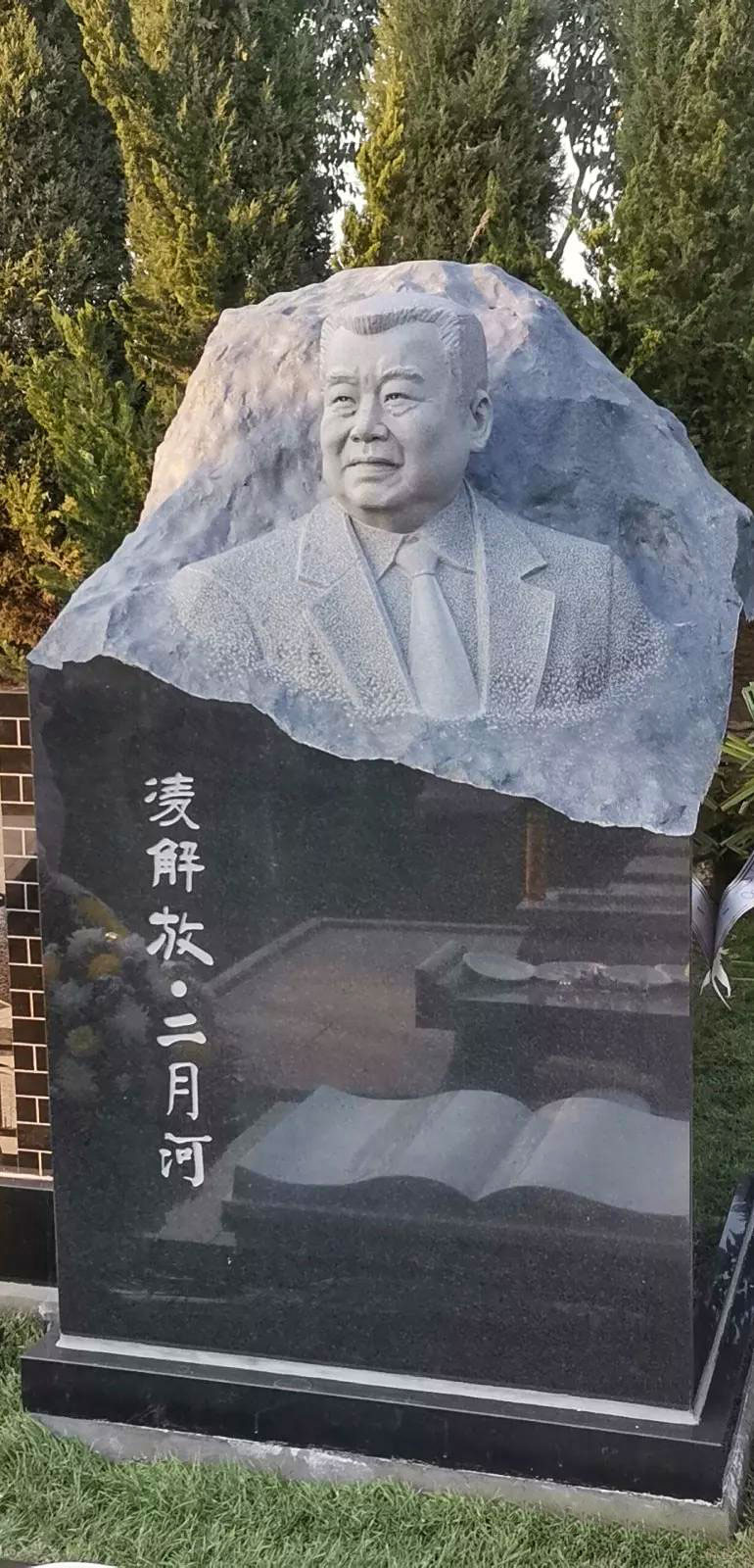 二月河的骨灰被放在了南陽紫山匯仙園公墓,這是一所十分雅致的墓園,里面設計得像一座美觀的園林,而且可以讓親屬塑像造碑加以紀念,是一個非常有人性化的墓園。二月河所在的墓地就在這座美麗的墓園一角,他就安靜地躺在下面,接受親屬的紀念,他的墓碑是用純黑色的花崗巖制作成的,石碑上還有一個二月河老師的半身頭像雕塑,雕像中的他面容肅穆,一直眺望著遠方,仿佛是為了再次看見那些他想念的人,那些也同時在想念他的熟悉面孔。