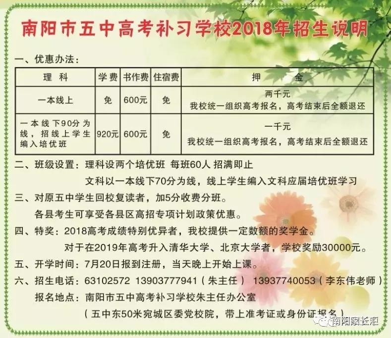 【招生計劃】南陽市各縣區理科429分以上,文科477分,,根據報名先后順序,招滿為止。2018年6月26日起,考生攜帶身份證、準考證、高考成績單及有關費用到南陽市成達高考補習學校報名處報名,招滿為止。7月20日開學。