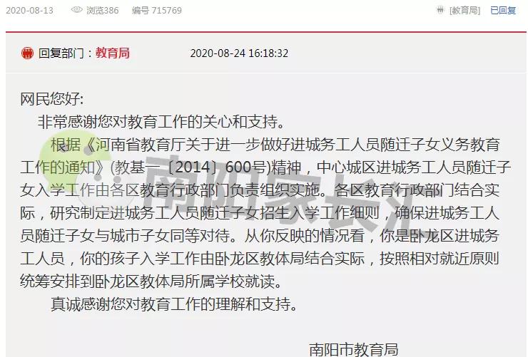 對此南陽市教育局回復如下: