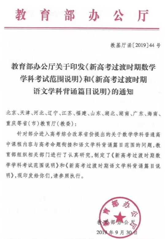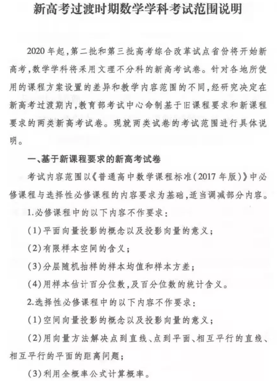 近日,教育部辦公廳關于印發《新高考過渡時期數學學科考試范圍說明》和《新高考過渡時期語文學科背誦篇目說明》的通知,針對新高考各地使用課程方案設置的差異和教學內容范圍不同命制兩套考卷,并對考卷考試范圍做了具體說明。本文自主招生在線團隊同步更新《新高考過渡時期數學學科考試范圍說明》的通知,具體如下: