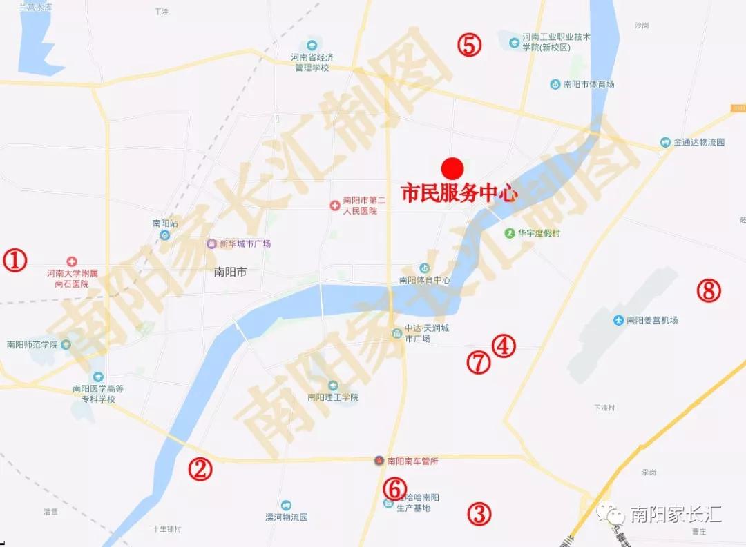 南陽市第八完全學校位置(示范區):月季園以南、李高路與東外環路交叉口西南角,獅子莊處(機場東北角與高鐵站之間。),