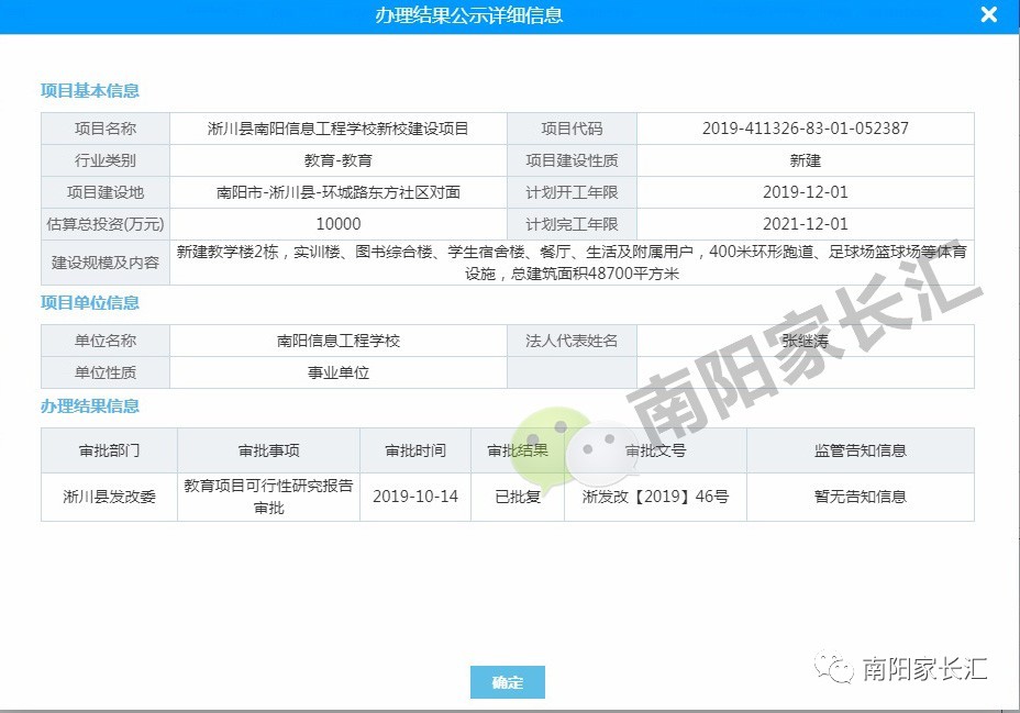 南陽信息工程學校新校建設項目獲批復 南陽職專 南陽中專 南陽信息工程學校 未知/陽光 2019-10-17 次瀏覽 近日,南陽家長匯從河南省發改委了解,淅川縣南陽信息工程學校新校建設項目 教育項目可行性研究報告審批事項,已獲淅川縣發改委批復。 從辦理結果公示詳細信息中發現:淅川縣南陽信息工程學校新校建設項目,項目建設地位于淅川縣環城路東方社區對面,估算總投資一億,新建教學樓2棟,實訓樓、圖書綜合樓、學生宿舍樓、餐廳、生活及附屬用戶,400米環形跑道、足球場籃球場等體育設施,總建筑面積48700平方米。該項目計劃開工年限2019-12-01,計劃完工年限2021-12-01。 南陽信息工程學校 南陽信息工程學校前身為淅川縣共產主義勞動大學,1980年更名為淅川縣農民技術學校, 原址位于河南省南陽市淅川縣厚坡鎮齊崗,1985年12月遷至上集鄉石板河村(原608礦),占地面積約3萬平方米,1992年3月經淅川縣委、縣政府批準遷至新車站東(原城關鎮南陽路今淅川縣丹江大道東段)。 1999年,由原淅川縣成人中專、淅川縣職業中專合并并更名為淅川縣成人職專。于2000年12月28日,南陽信息工程學校正式掛牌,這標志著辦學水平將邁上一個新的臺階。 南陽信息工程學校是一所經省政府批準,報國家教育部備案的國家級重點中等專業學校。學校擁有先進的計算機中心、數控機床實習室、琴房、舞蹈排練廳、多媒體教室、圖書室、多功能餐廳等。