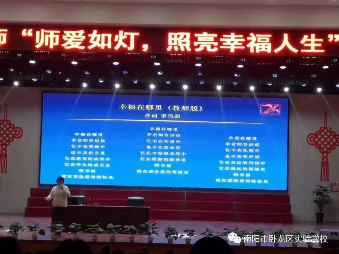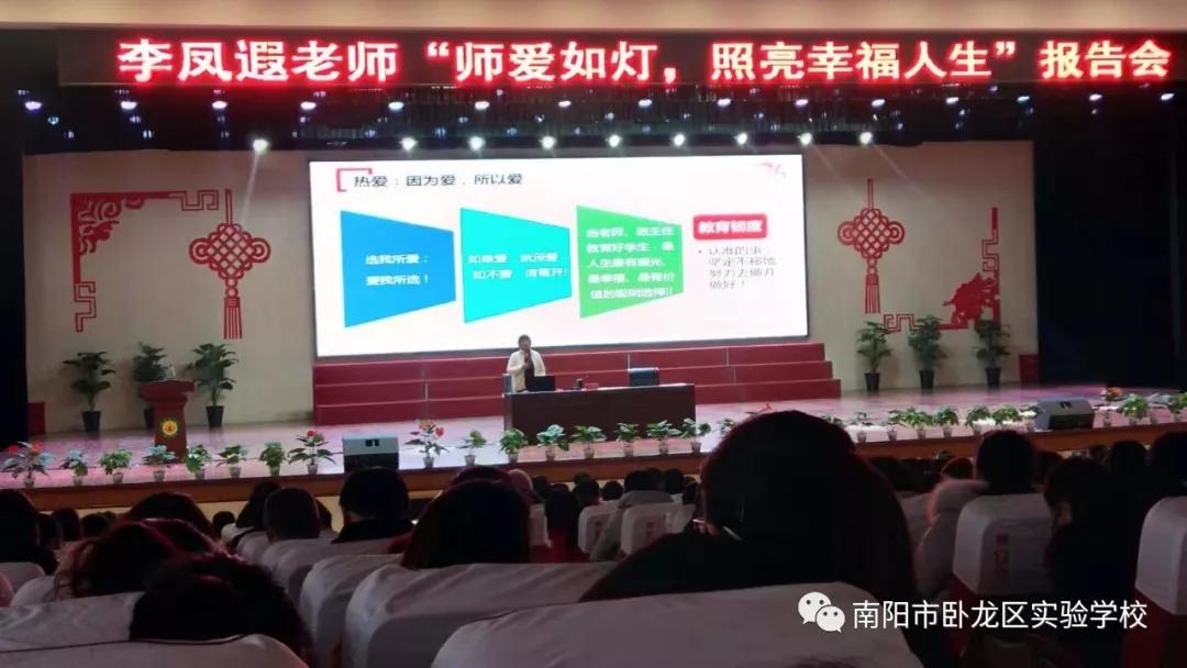 2019年12月19日下午,臥龍區實驗學校全體教師早早來到南陽市八中禮堂,參加全國知名班主任、江蘇省特級教師李鳳遐老師的《師愛如燈,照亮幸福人生》報告會。