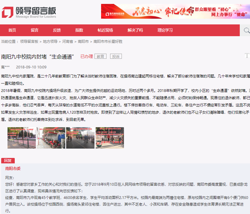 2018年暑假,為改善學校硬件環境,為學生提供安全舒適的運動環境,該校升級改造了操場,鋪設了塑膠跑道,封閉了緊挨跑道的3個便門,為住宅區留了2個方便出行的便門,既不影響住戶出行,也為學生和住戶安全提供了保障。此舉措得到了住宅區大部分居民的擁護支持,但有極少數居民對此不理解多次向消防部門反映情況,雖經多方多次解釋仍持懷疑態度。2018年9月28日上午10時,南陽市臥龍區消防大隊官兵一行6人駕駛消防車輛順利駛入校園住宅區,進行實地消防演練,順利完成預期任務,不存在網友所反映的消防車輛無法駛入封堵消防通道的情況。