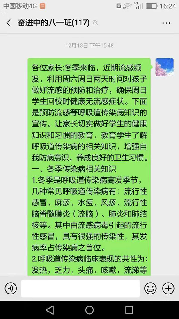 第二舉措:利用班級微信群、主題班會等進行防流感教育。學校利用訊信通、微信群等對家長和學生進行防流感知識教育。班主任召開主題班會,教育學生正確預防流感,教育學生保持良好生活習慣,注意營養平衡,保證充足的睡眠,多吃水果、多飲水,避免疲勞;教育學生平時用流動水和肥皂洗手,保持個人和環境衛生清潔。