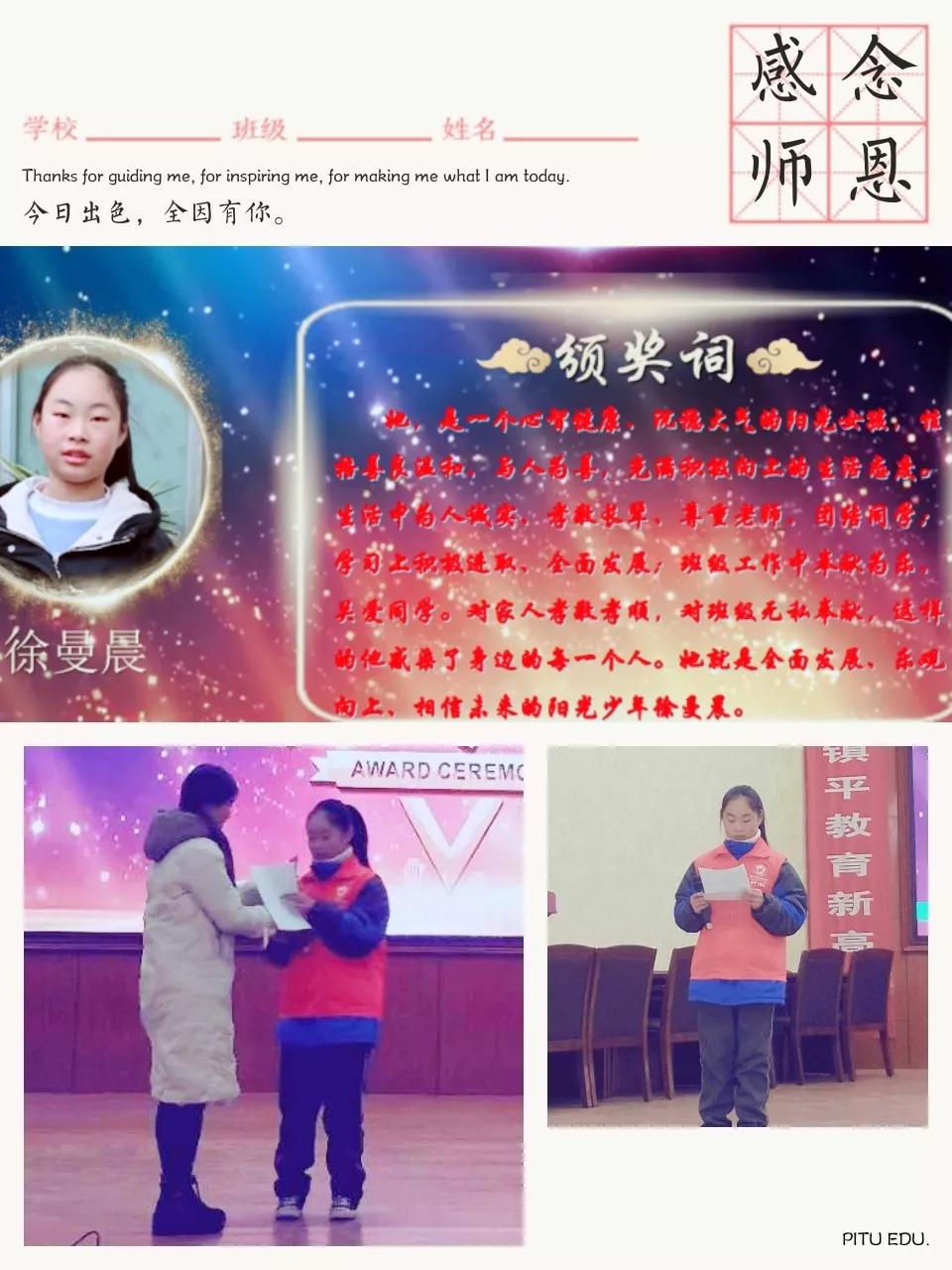 頒獎典禮伊始,主持人簡要介紹了首屆“美德少年”評選活動的情況,并向現場老師同學介紹了到場家長。隨即宣讀表彰決定,徐曼晨等十名同學獲得“美德少年”稱號,宣讀頒獎詞,獲獎學生發表感言,班主任為他們頒獎,并邀請家長合影留念。