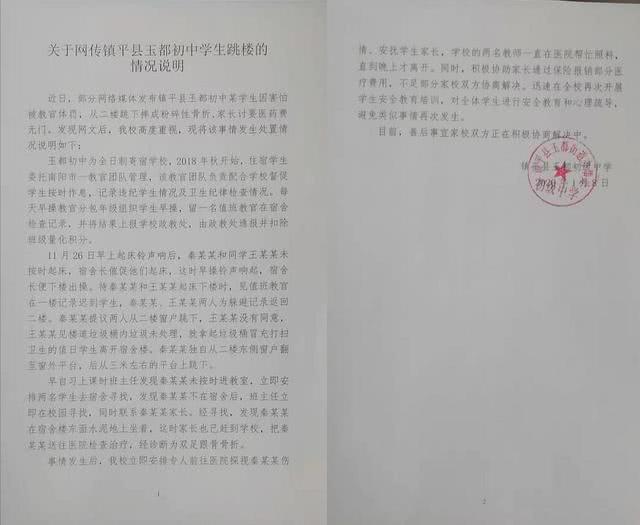 近日,部分網絡媒體發布鎮平縣玉都初中某學生因害怕被教官體罰,從二樓跳下摔成粉碎性骨折,家長討要醫藥費無門。發現網文后,我校高度重視,現將該事情發生處置情況說明如下: