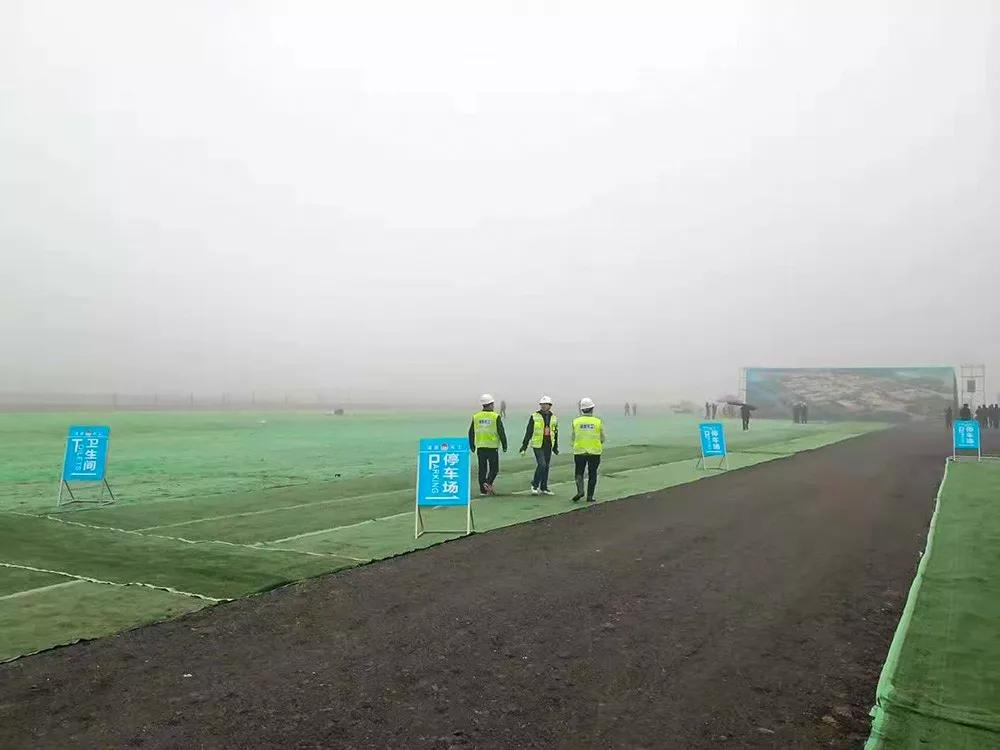 奠基儀式現場布置不復雜,大主持臺下擺放一些綠植,最近下過雨地上泥濘,部分地面鋪有工程地毯方便大家行走。