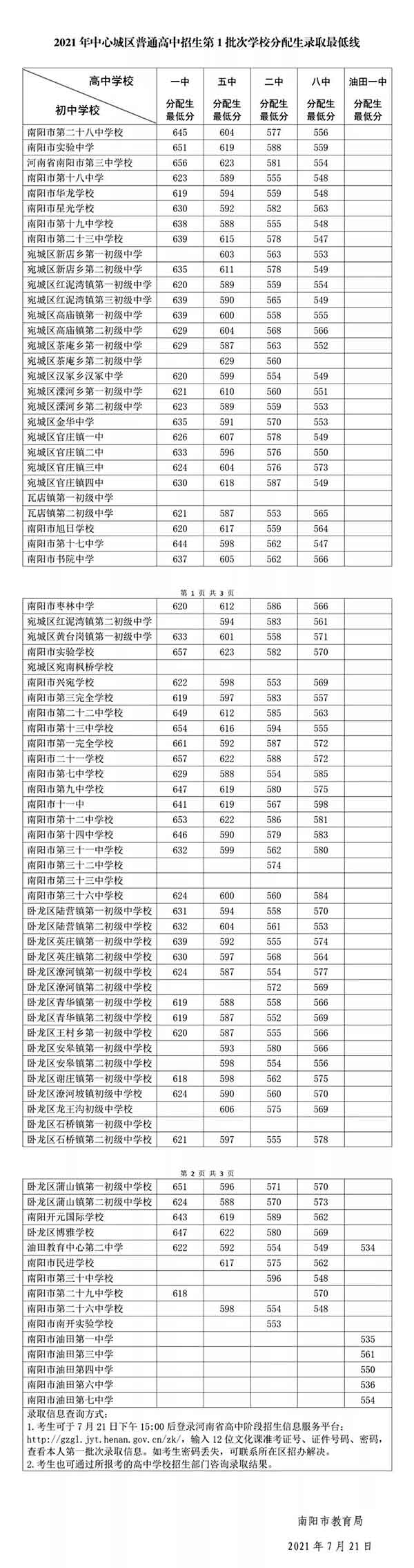 2021年南陽市中心城區普通高中招生第1批次學校分配生錄取最低線公布